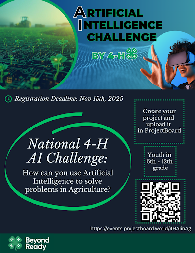 On October 1, National 4-H in partnership with Google introduced the 4-H AI Challenge. The challenge is open to youth in two age categories: Level 1: Ages 13 – 15 and Level 2: Ages 16 – 18. Youth work in small teams with an adult advisor to develop novel solutions to agriculture issues in their community. Projects will be submitted through ProjectBoard and must be entered by November 15, 2025. Resources including instructions, FAQs, and judging rubric is found on the Challenge website. Projects will be judged on a national level with cash prizes for first, second, and third place. Check out previous spring projects here: https://events.projectboard.world/4HAI Specific questions about the Challenge can be sent to Dr. Mark Light at North Carolina A&T or Alexa Groff at Iowa State University.